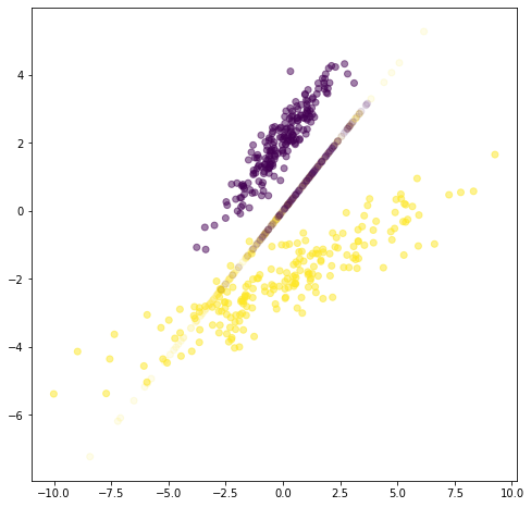 plt.scatter(X3[:,0], X3[:,1], c=Y, alpha=.5, label="original data")